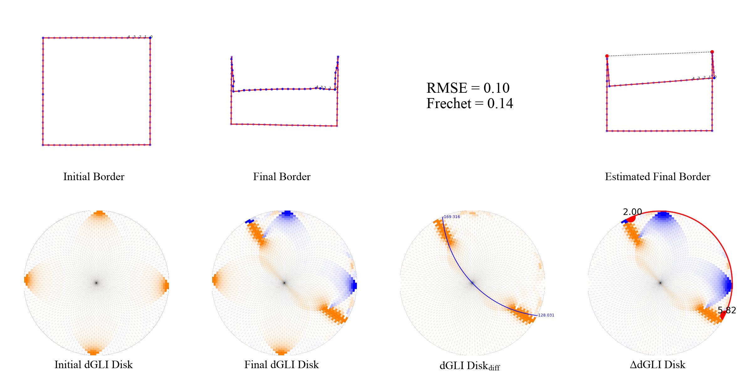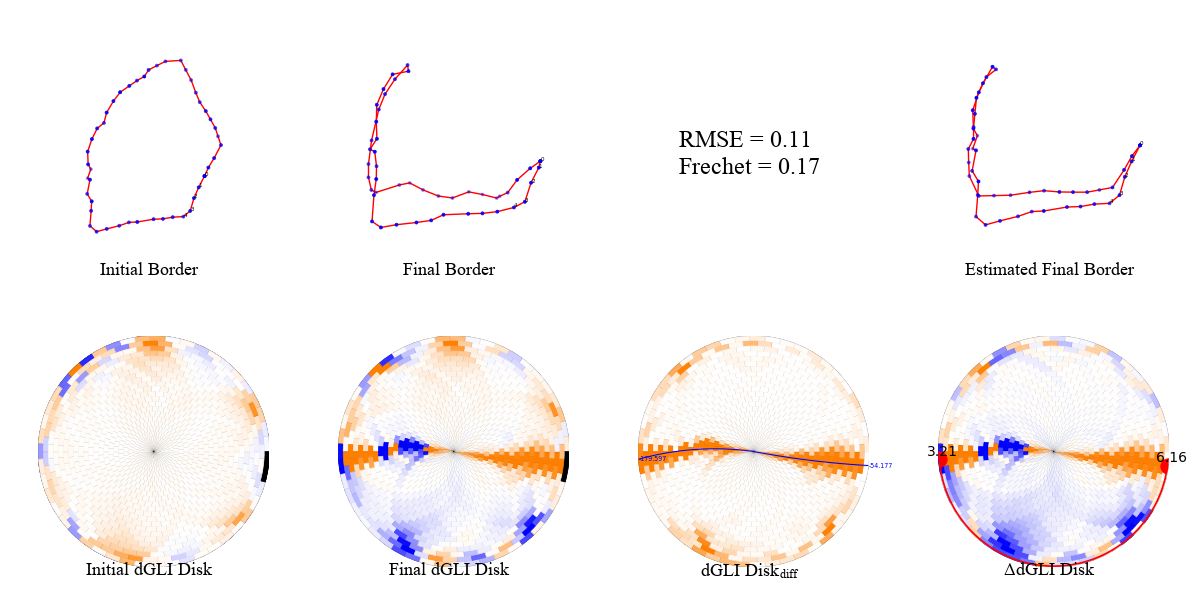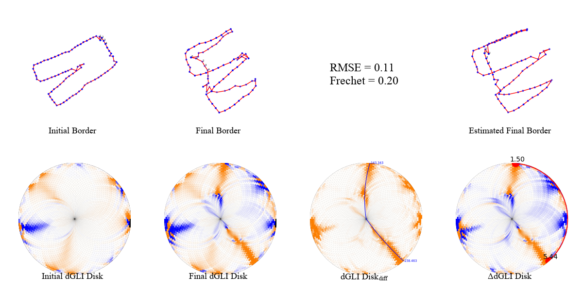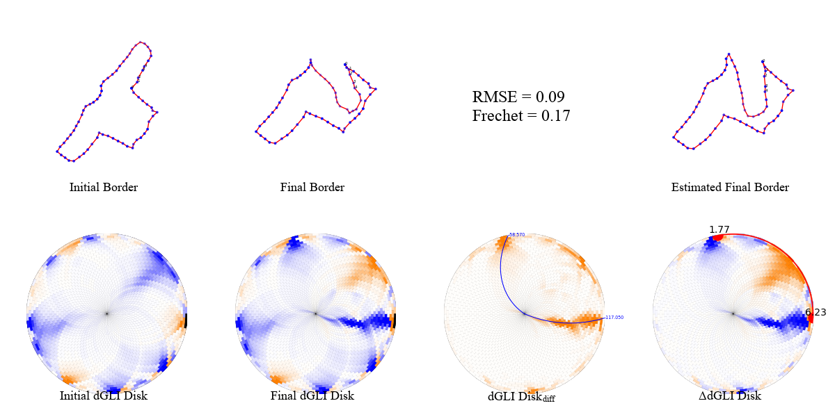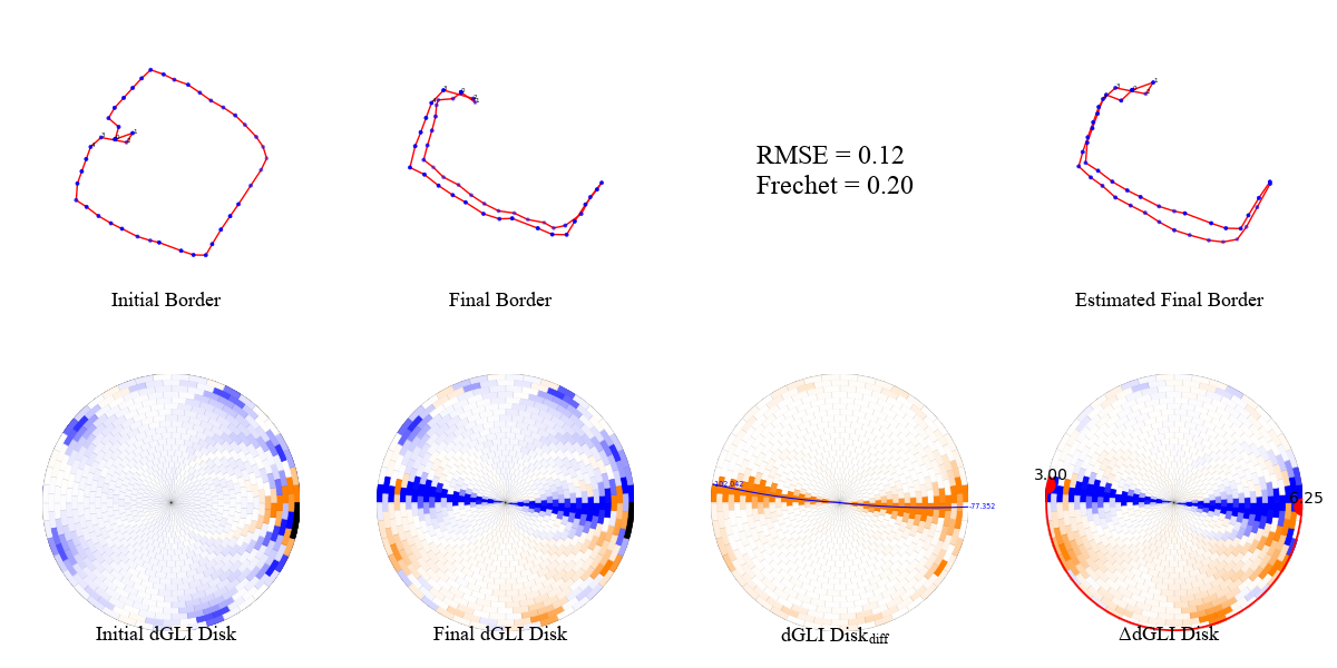 We present a few examples of the evolution of th dGLI disk with the state of the cloth. We visualize the cloth border alongside the dGLI disk and the dGLI disk difference. The dGLI disk is the proposed rearrangement of the dGLI Matrix. Notice a curve appearing on the dGLI disk when the cloth is folded. This curve is visible in isolation on the dGLI disk difference.