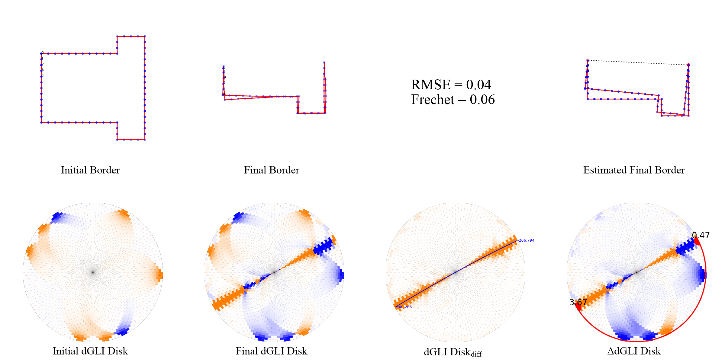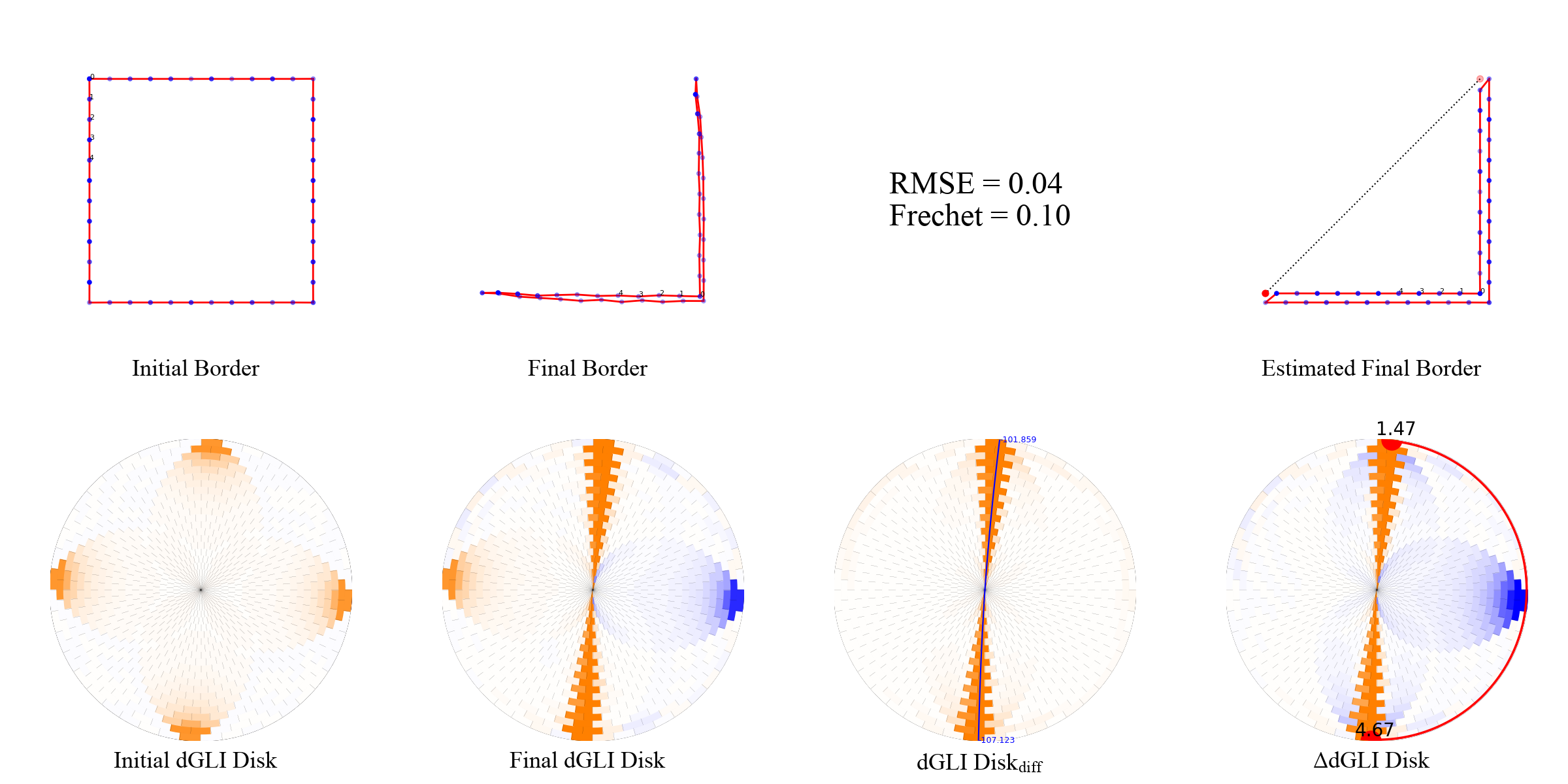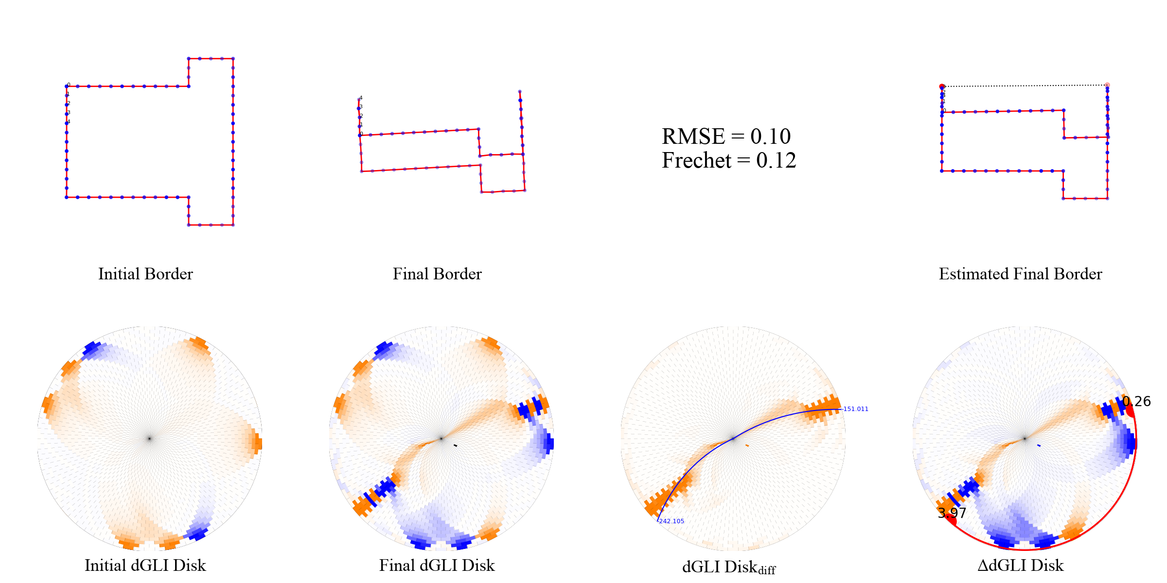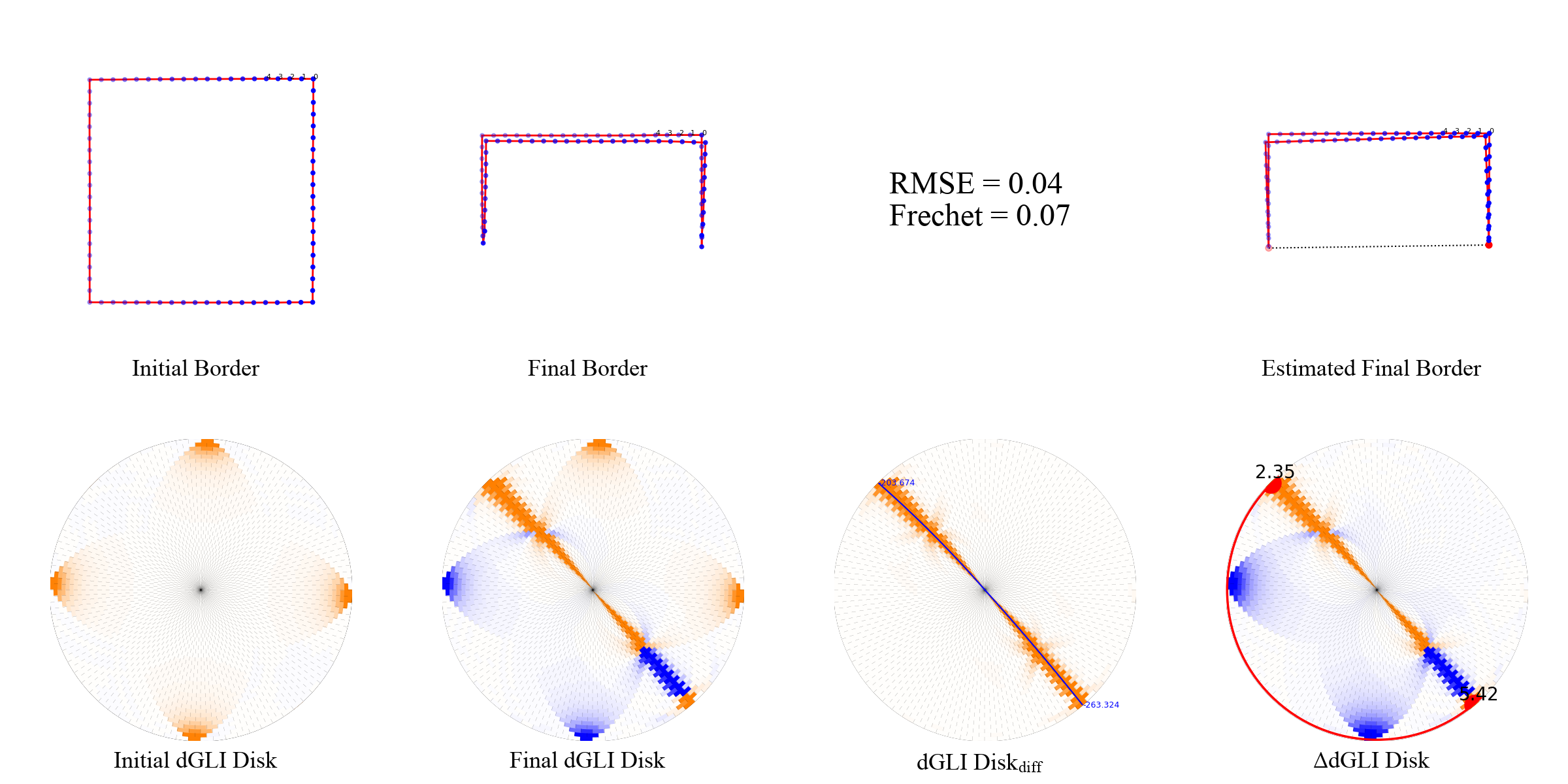 We present a few examples of the evolution of th dGLI disk with the state of the cloth. We visualize the cloth border alongside the dGLI disk and the dGLI disk difference. The dGLI disk is the proposed rearrangement of the dGLI Matrix. Notice a curve appearing on the dGLI disk when the cloth is folded. This curve is visible in isolation on the dGLI disk difference.